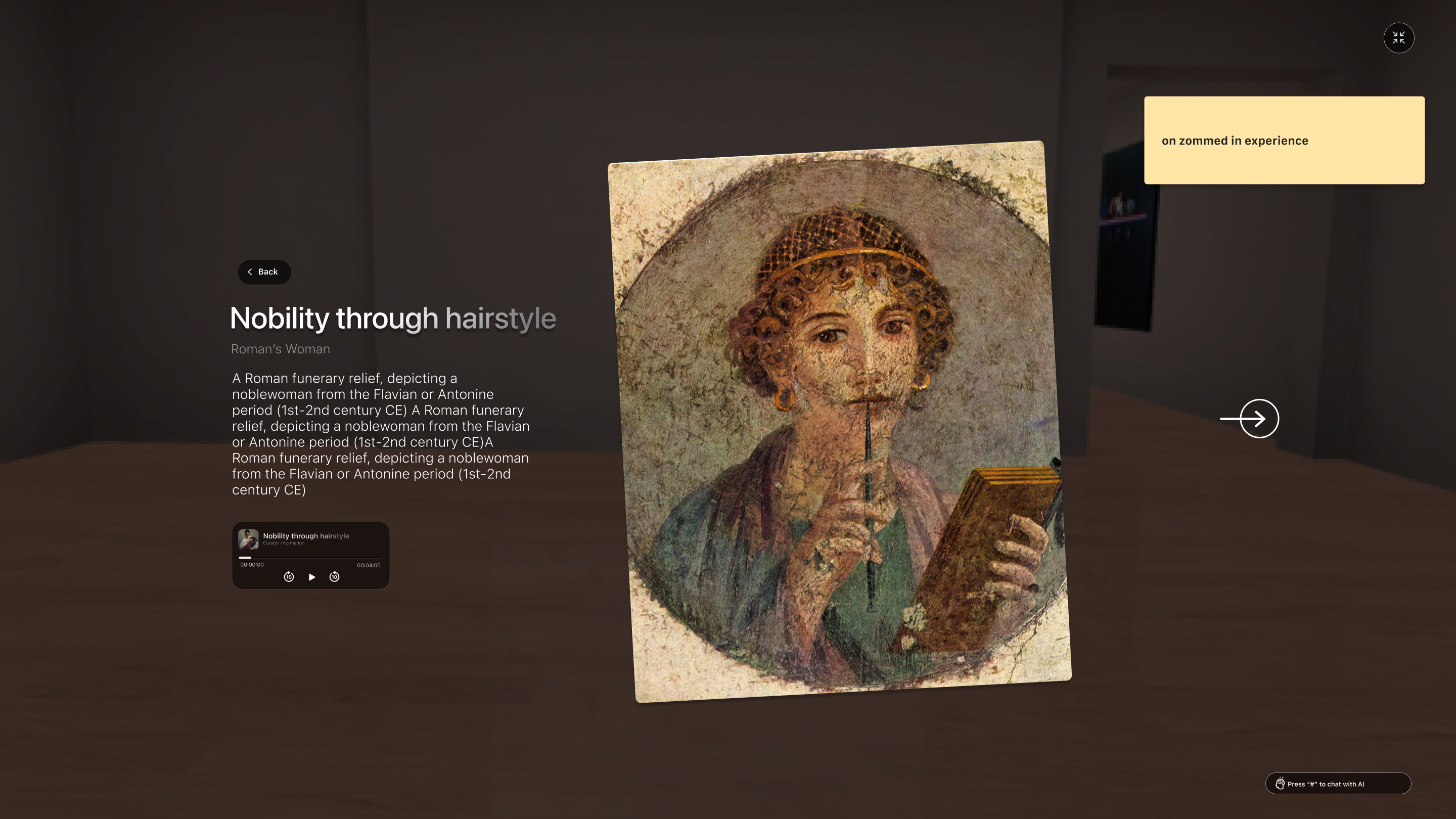 When a media item is selected, it appears directly within the user’s line of sight. Images, videos, audio, and 3D models open in floating frames that appear naturally within the user’s field of view. There were many many many many rounds of prototyping to refine how these elements behave in user space , from proximity and interaction zones to the balance between content and the main artwork.